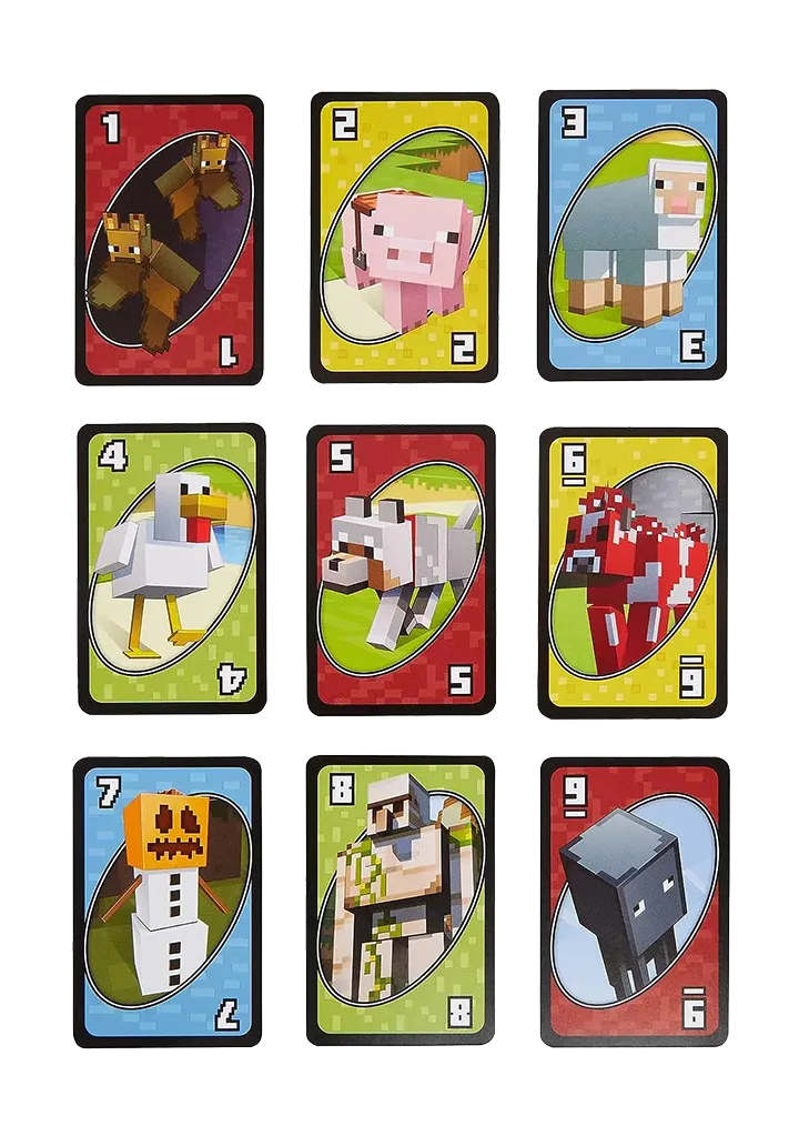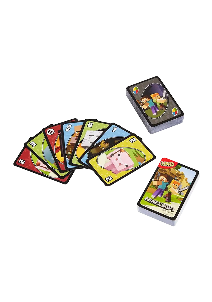 As in the UNO™ you love, UNO™ Minecraft gameplay involves players racing to get rid of all their cards, but this version features cards with Minecraft characters and images and a special rule! You want to match a card in your hand with the current card shown on top of the deck, and you’ll score points for the cards your opponents are left holding. And in UNO™ Minecraft, there’s also a new type of action card; when you draw the Creeper card, show it to the other players and they’ll have to draw three more cards! The first player to reach 500 points wins. When you’re down to one card, don’t forget to yell ‘UNO!’ Contains 112 cards plus instructions. For 2 to 10 players, ages 7 and older. Easy to pick up, impossible to put down. Colors and decorations may vary.