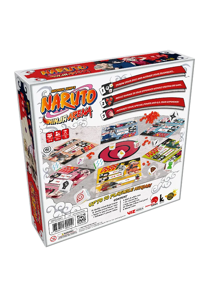 Naruto: Ninja Arena is the first game using the Roll & Clash system. During the game, you throw your dice as quickly as you can and use the results to activate Techniques without stopping the game. Everyone plays at the same time in a frantic battle to be the last Ninja Standing! The game ends when all players are K.O. or eliminated except one.